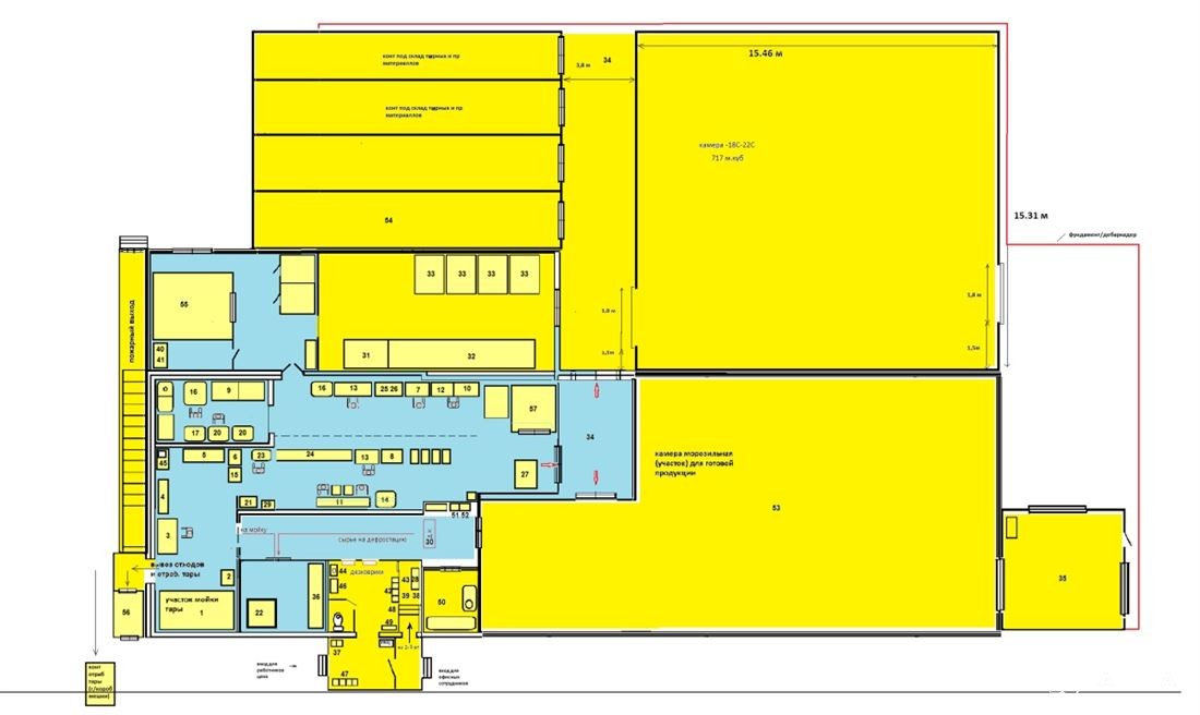 Помещения (зоны): раздевалка/санпропускник, санузел, дефростация (воздушной/стеллажной, в воде (емкости), распаковки, распиловки, конвейер глазуровки, разделки (филетирования), камера шоковой заморозки, установка контактной заморозки, упаковки (вакуум/скин, запайка, гофрокороб), холодильная камера в производстве, камера отходов, склад тары, склад химии, склад готовой продукции, компрессорная 2 шт.
