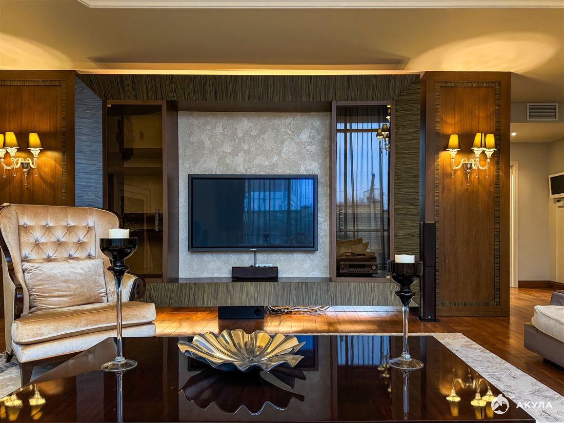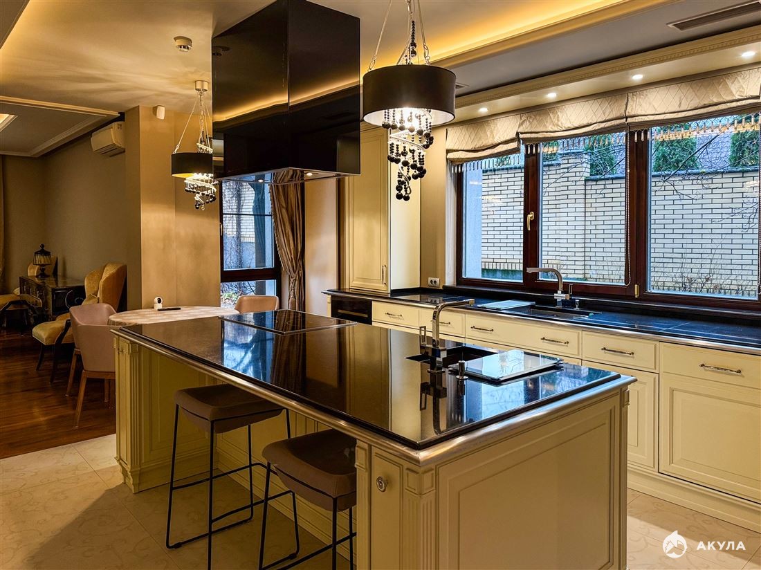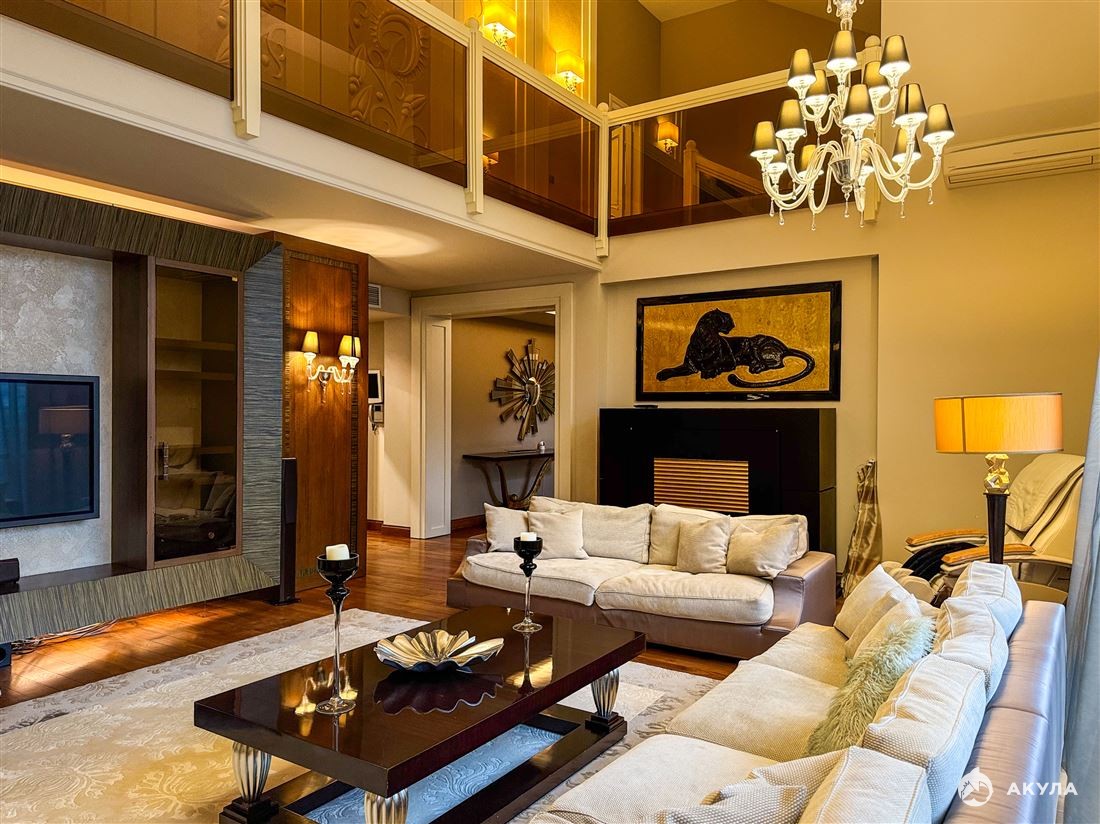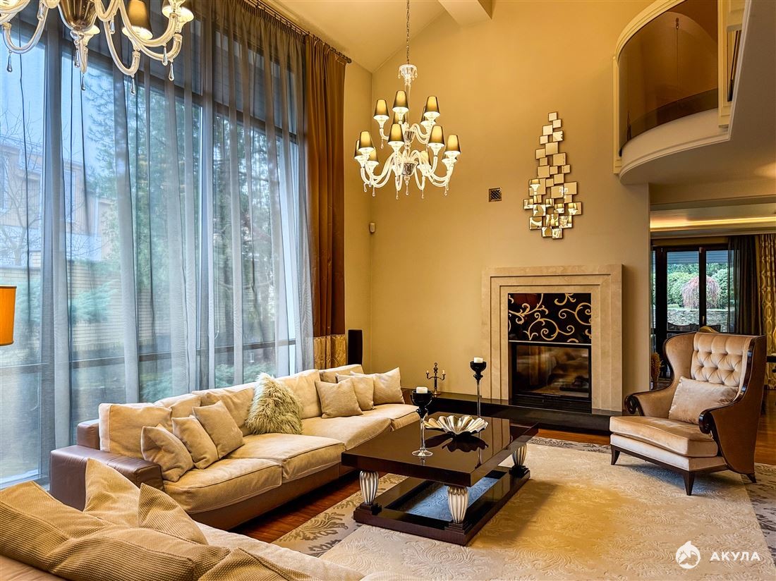 Первый этаж встречает просторной гостиной с двусторонним камином и итальянской кухней с техникой Miele, откуда открывается выход на террасу. Также на первом этаже расположена уютная спальня с ванной комнатой и гардеробной. Второй свет высотой 8 метров создаёт ощущение простора, гармонично объединяя все зоны первого этажа.