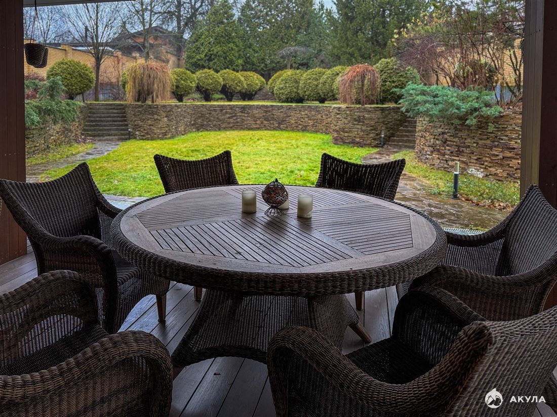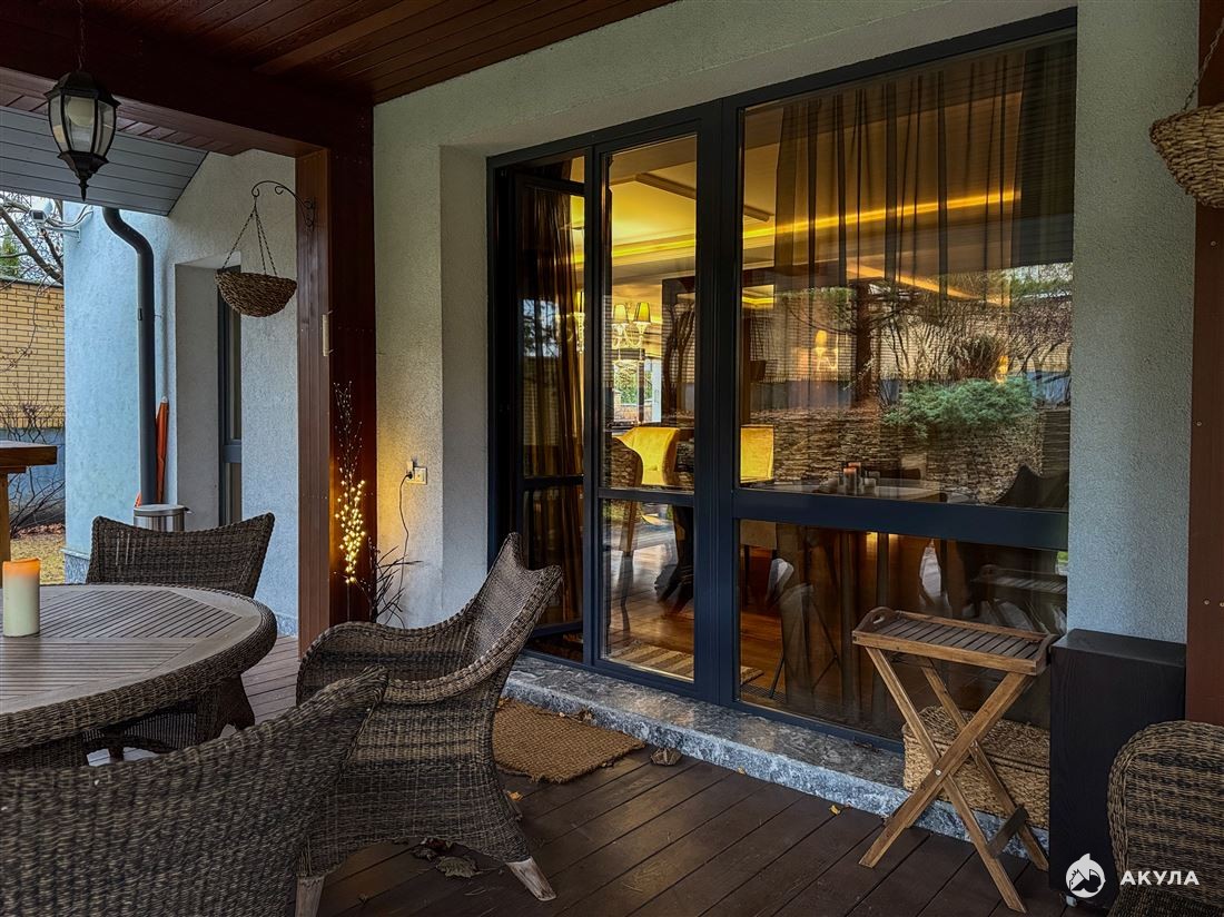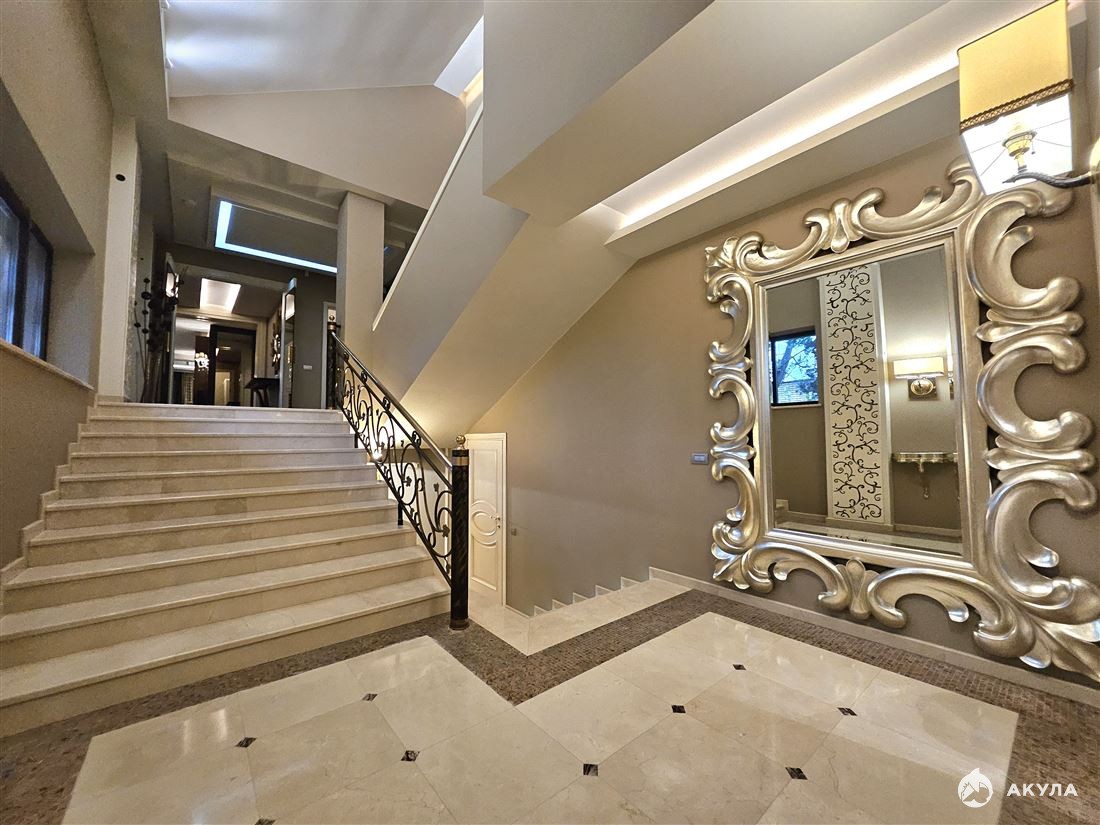 Особая гордость дома — спа-зона, отделанная испанским мрамором: просторная сауна, джакузи итальянского производства. Для досуга предусмотрен кинотеатр. Полы в доме натуральный орех, мрамор, шпон дуба. Крыша немецкая черепица (пожизненная гарантия) + лиственница.