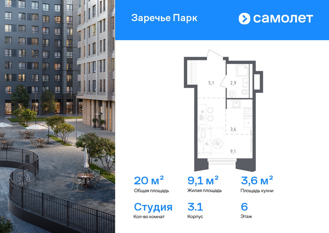 Строим кварталы для жизни с заботой о будущем. Предлагается квартира студия бизнес-класса 20 кв.м в корпусе 3.1 на 6 этаже, в ЖК «Заречье Парк»