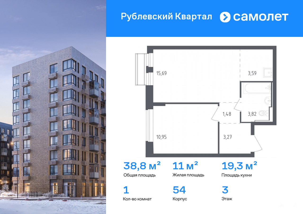 Строим кварталы для жизни с заботой о будущем. Предлагается 1-комнатная квартира комфорт-класса 38, 8 кв.м в корпусе 54 на 3 этаже, в ЖК «Рублевский Квартал»