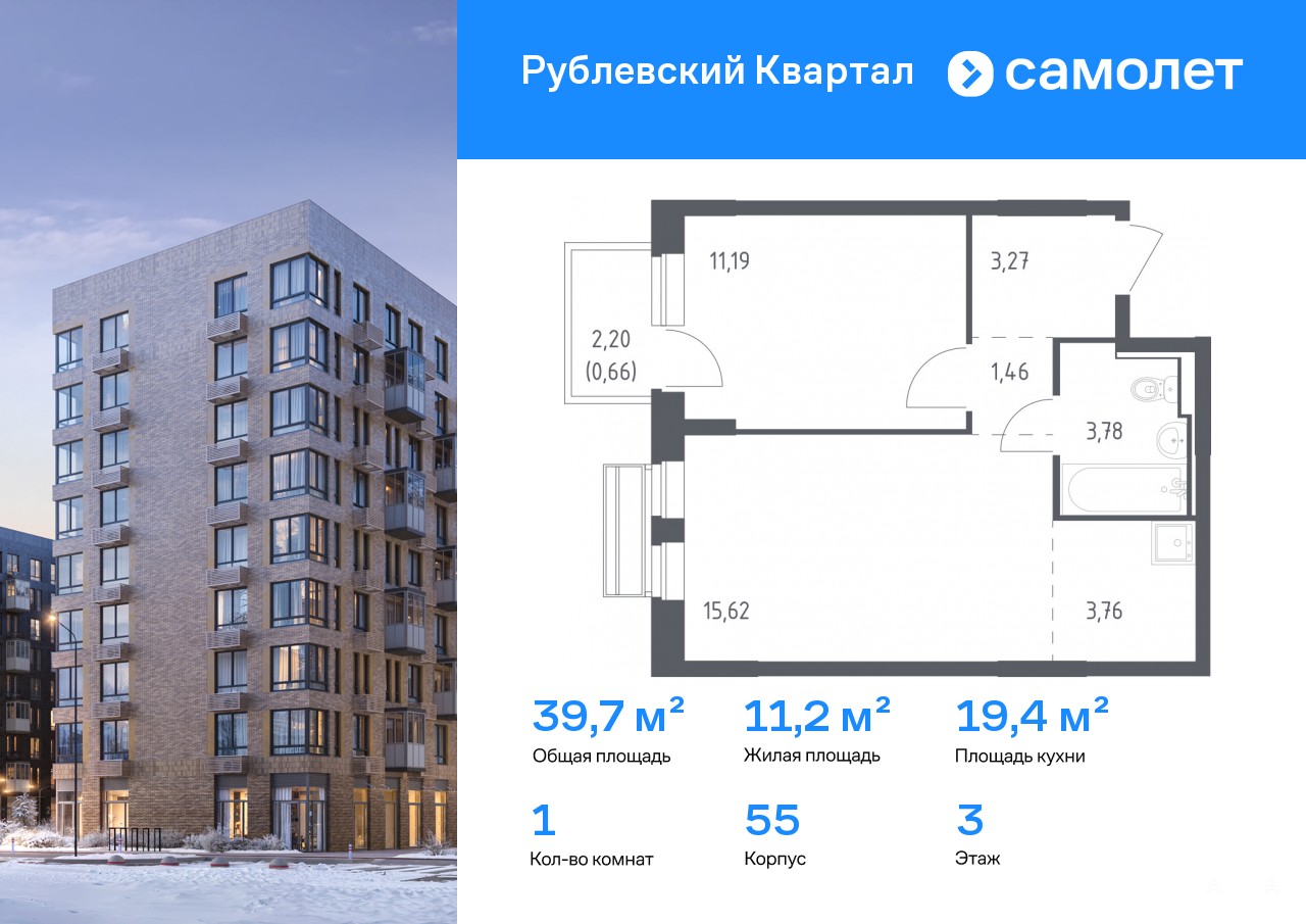 Строим кварталы для жизни с заботой о будущем. Предлагается 1-комнатная квартира комфорт-класса 39, 74 кв.м в корпусе 55 на 3 этаже, в ЖК «Рублевский Квартал»