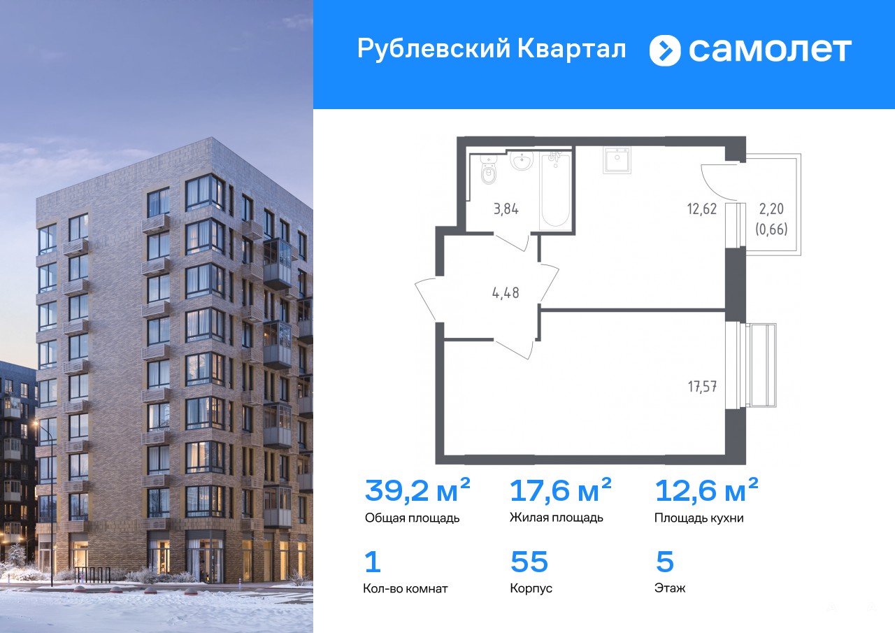 Строим кварталы для жизни с заботой о будущем. Предлагается 1-комнатная квартира комфорт-класса 39, 17 кв.м в корпусе 55 на 5 этаже, в ЖК «Рублевский Квартал»
