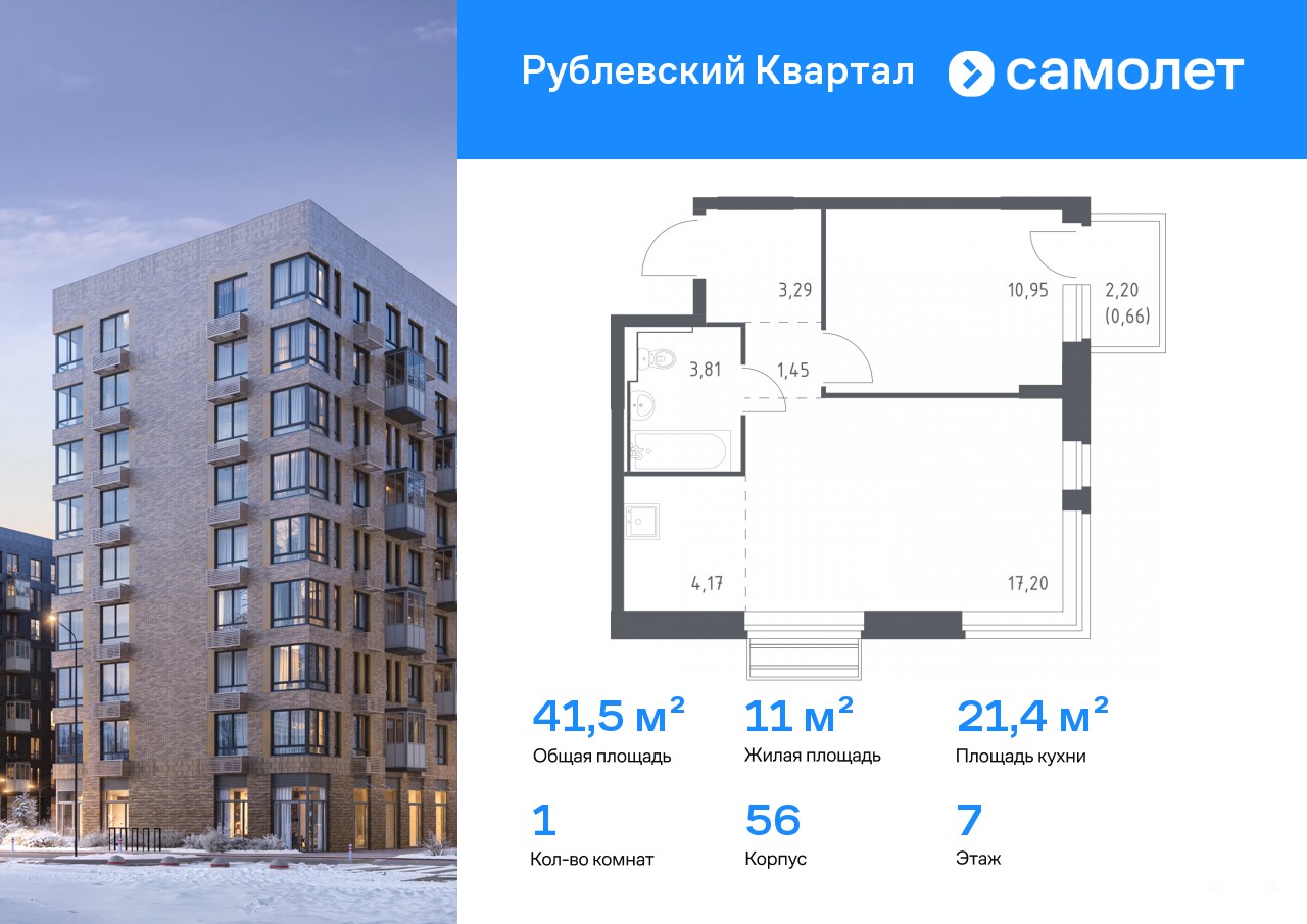 Строим кварталы для жизни с заботой о будущем. Предлагается 1-комнатная квартира комфорт-класса 41, 53 кв.м в корпусе 56 на 7 этаже, в ЖК «Рублевский Квартал»