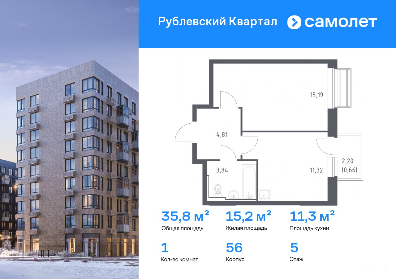 Строим кварталы для жизни с заботой о будущем. Предлагается 1-комнатная квартира комфорт-класса 35, 82 кв.м в корпусе 56 на 5 этаже, в ЖК «Рублевский Квартал»