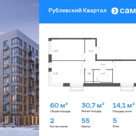 Строим кварталы для жизни с заботой о будущем. Предлагается 2-комнатная квартира комфорт-класса 59, 97 кв.м в корпусе 55 на 5 этаже, в ЖК «Рублевский Квартал» Квартира без отделки. Доступность опции «отделка» и возможность комплектации мебелью и декором уточняйте у...