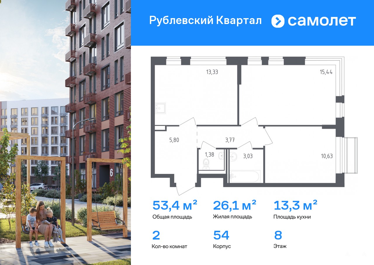 Строим кварталы для жизни с заботой о будущем. Предлагается 2-комнатная квартира комфорт-класса 53, 38 кв.м в корпусе 54 на 8 этаже, в ЖК «Рублевский Квартал»