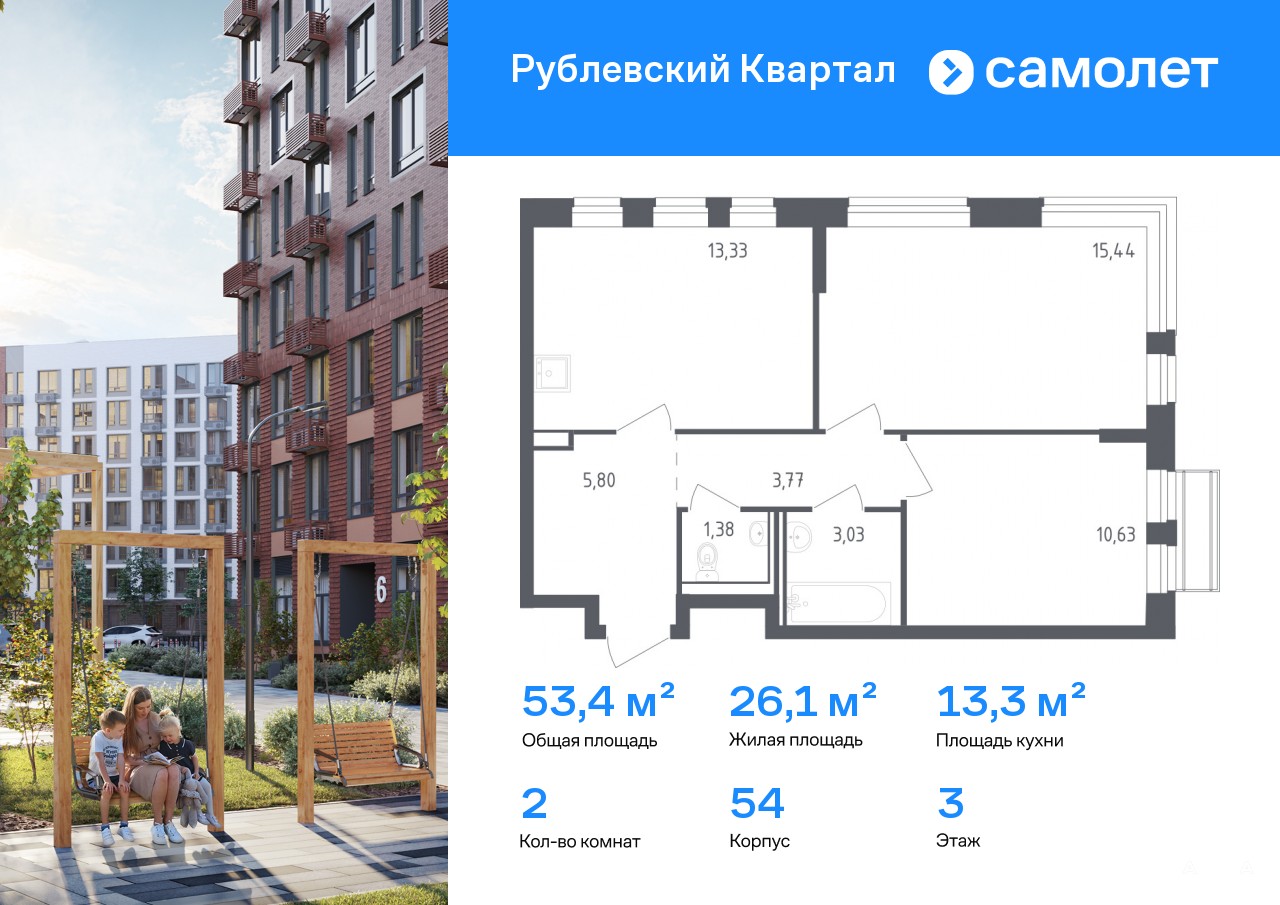 Строим кварталы для жизни с заботой о будущем. Предлагается 2-комнатная квартира комфорт-класса 53, 38 кв.м в корпусе 54 на 3 этаже, в ЖК «Рублевский Квартал»
