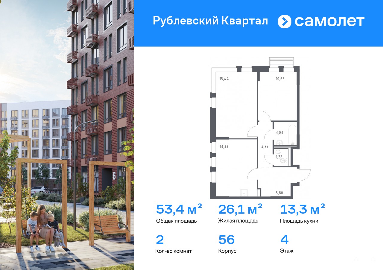 Строим кварталы для жизни с заботой о будущем. Предлагается 2-комнатная квартира комфорт-класса 53, 38 кв.м в корпусе 56 на 4 этаже, в ЖК «Рублевский Квартал»