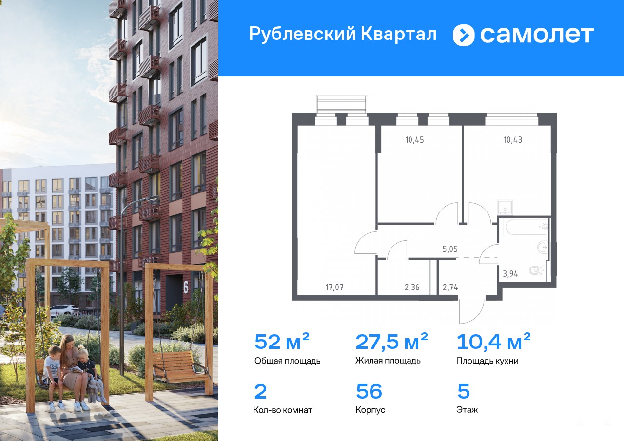 Строим кварталы для жизни с заботой о будущем. Предлагается 2-комнатная квартира комфорт-класса 52, 04 кв.м в корпусе 56 на 5 этаже, в ЖК «Рублевский Квартал»