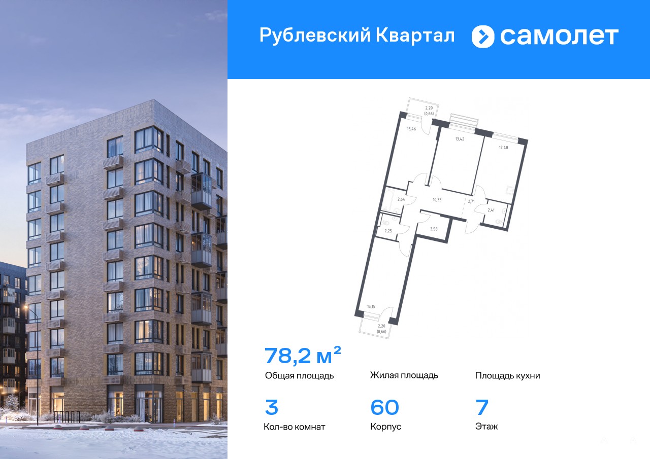 Строим кварталы для жизни с заботой о будущем. Предлагается 3-комнатная квартира комфорт-класса 78, 2 кв.м в корпусе 60 на 7 этаже, в ЖК «Рублевский Квартал»