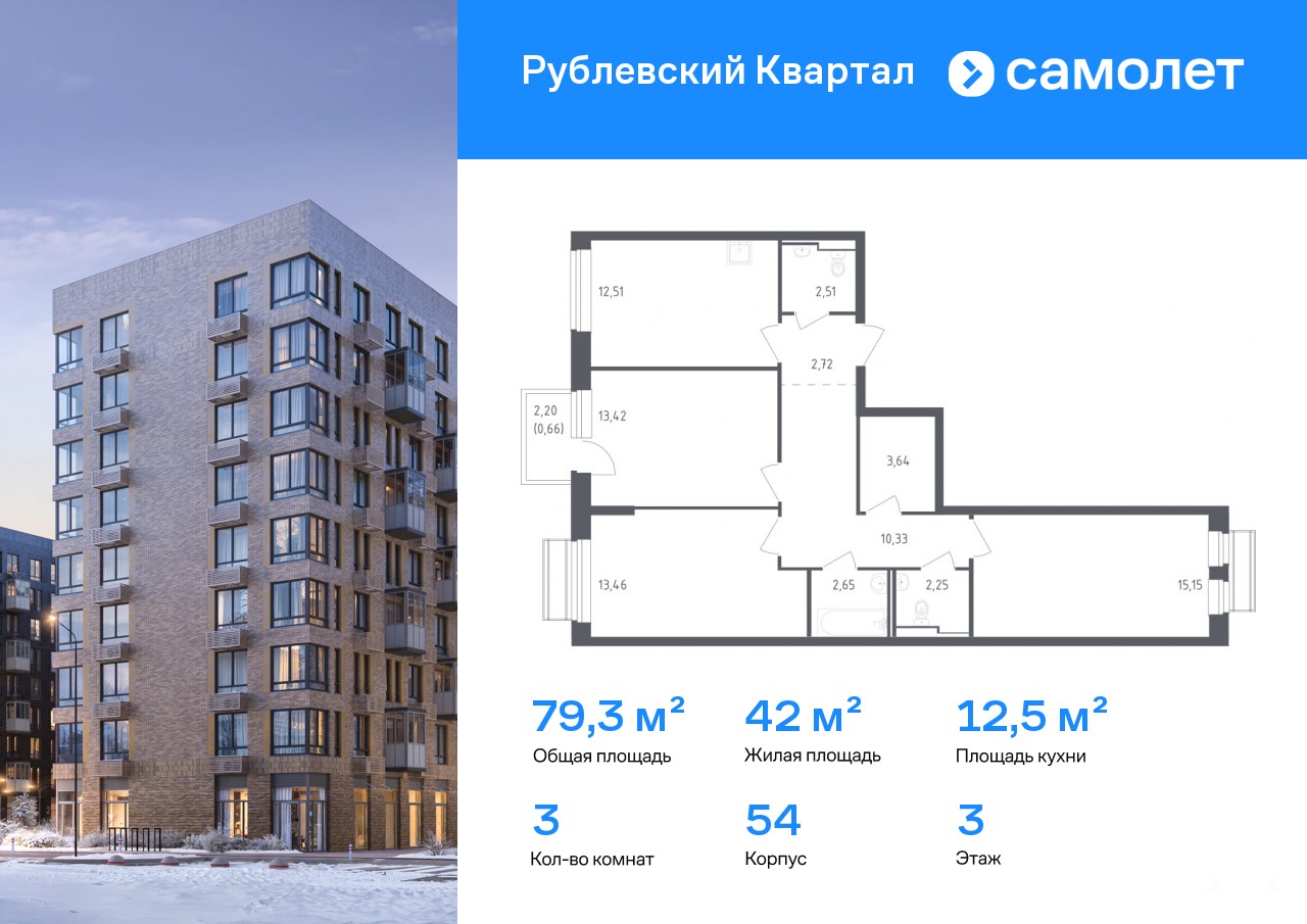 Строим кварталы для жизни с заботой о будущем. Предлагается 3-комнатная квартира комфорт-класса 79, 3 кв.м в корпусе 54 на 3 этаже, в ЖК «Рублевский Квартал»