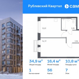 Строим кварталы для жизни с заботой о будущем. Предлагается 1-комнатная квартира комфорт-класса 34, 89 кв.м в корпусе 56 на 7 этаже, в ЖК «Рублевский Квартал» Квартира с чистовой отделкой. Доступность дополнительных опций уточняйте у застройщика. Приобрести квартиру возможно...