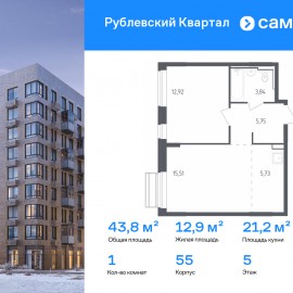 Строим кварталы для жизни с заботой о будущем. Предлагается 1-комнатная квартира комфорт-класса 43, 75 кв.м в корпусе 55 на 5 этаже, в ЖК «Рублевский Квартал» Квартира с чистовой отделкой. Доступность дополнительных опций уточняйте у застройщика. Приобрести квартиру возможно...