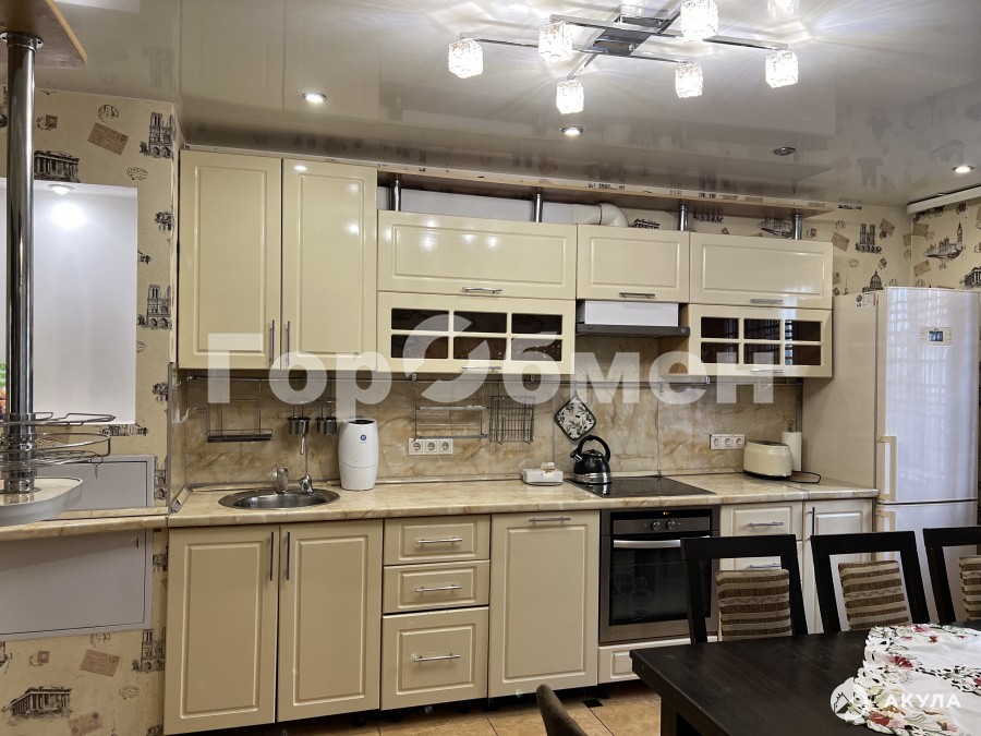 Кухня оборудована красивым современным гарнитуром цвета ваниль с удобной барной стойкой, с импортной бытовой техникой преимущественно LG и Gorenje: варочная панель, духовой шкаф, вытяжка, посудомоечная машина, широкий холодильник, тостер, чайник и т.д. Кухня вытянутой формы, поэтому она позволяет за обеденным столом разместить на постоянной основе не менее 8 человек.
