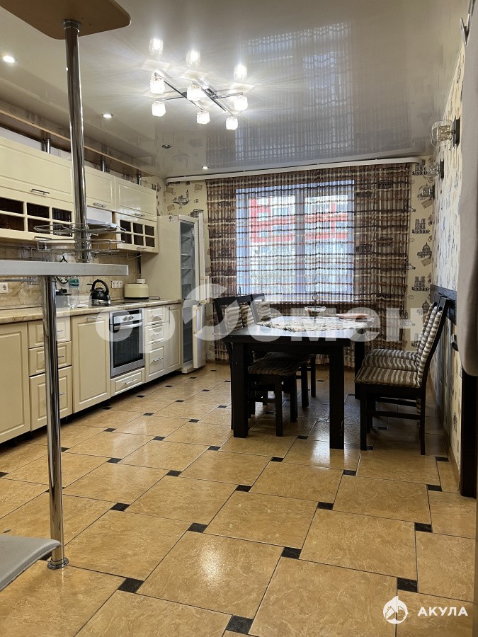 Кухня оборудована красивым современным гарнитуром цвета ваниль с удобной барной стойкой, с импортной бытовой техникой преимущественно LG и Gorenje: варочная панель, духовой шкаф, вытяжка, посудомоечная машина, широкий холодильник, тостер, чайник и т.д. Кухня вытянутой формы, поэтому она позволяет за обеденным столом разместить на постоянной основе не менее 8 человек.